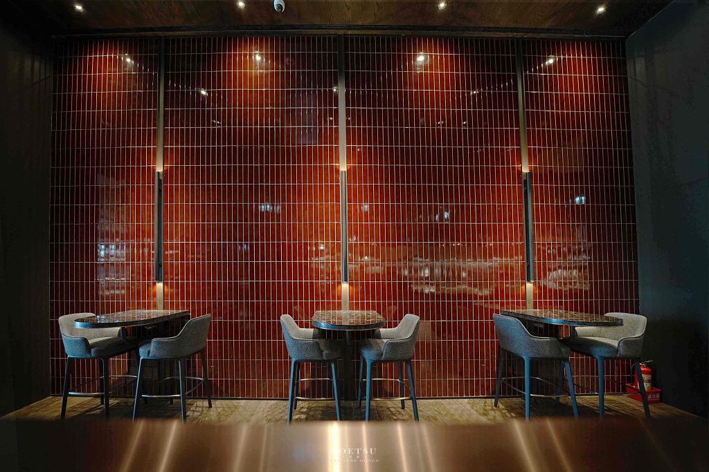 整體空間以深色木皮與暖調塗料復古酒紅磚牆鋪陳牆面